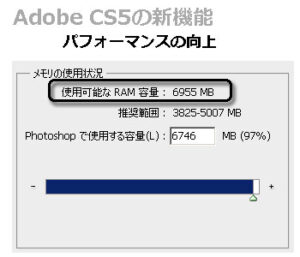 Adobe Photoshopは64bit環境にネイティブで対応するなど パフォーマンスが向上しましたが、 CS5ではパフォーマンス設定がさらに強化されました。